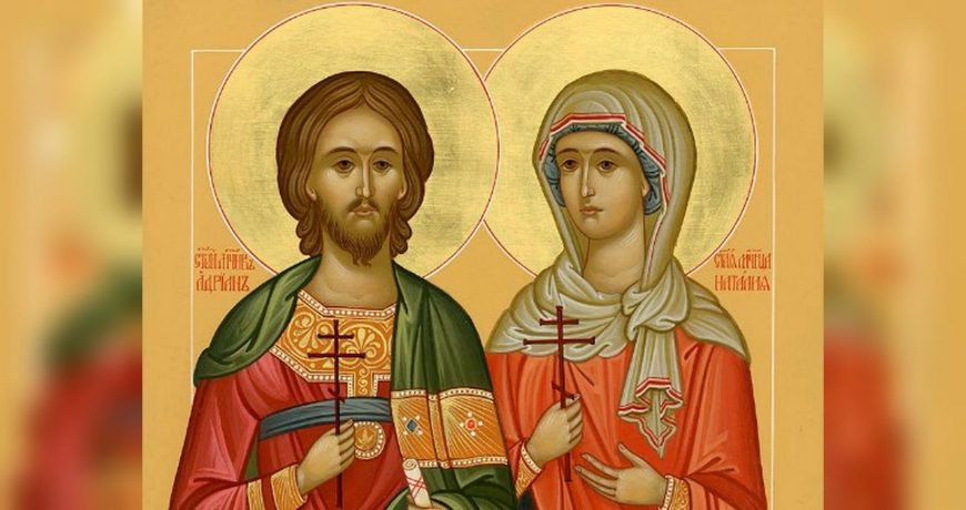 Мученица Наталья родилась в Никомедии, воспитывалась благочестивыми набожными родителями-христианами. С детства она испытывала любовь к Богу. Повзрослев, она познакомилась с владельцем судебной палаты, богатым Адрианом из языческой семьи, вышла за него замуж. Наталья боялась признаваться мужу в своем вероисповедании.