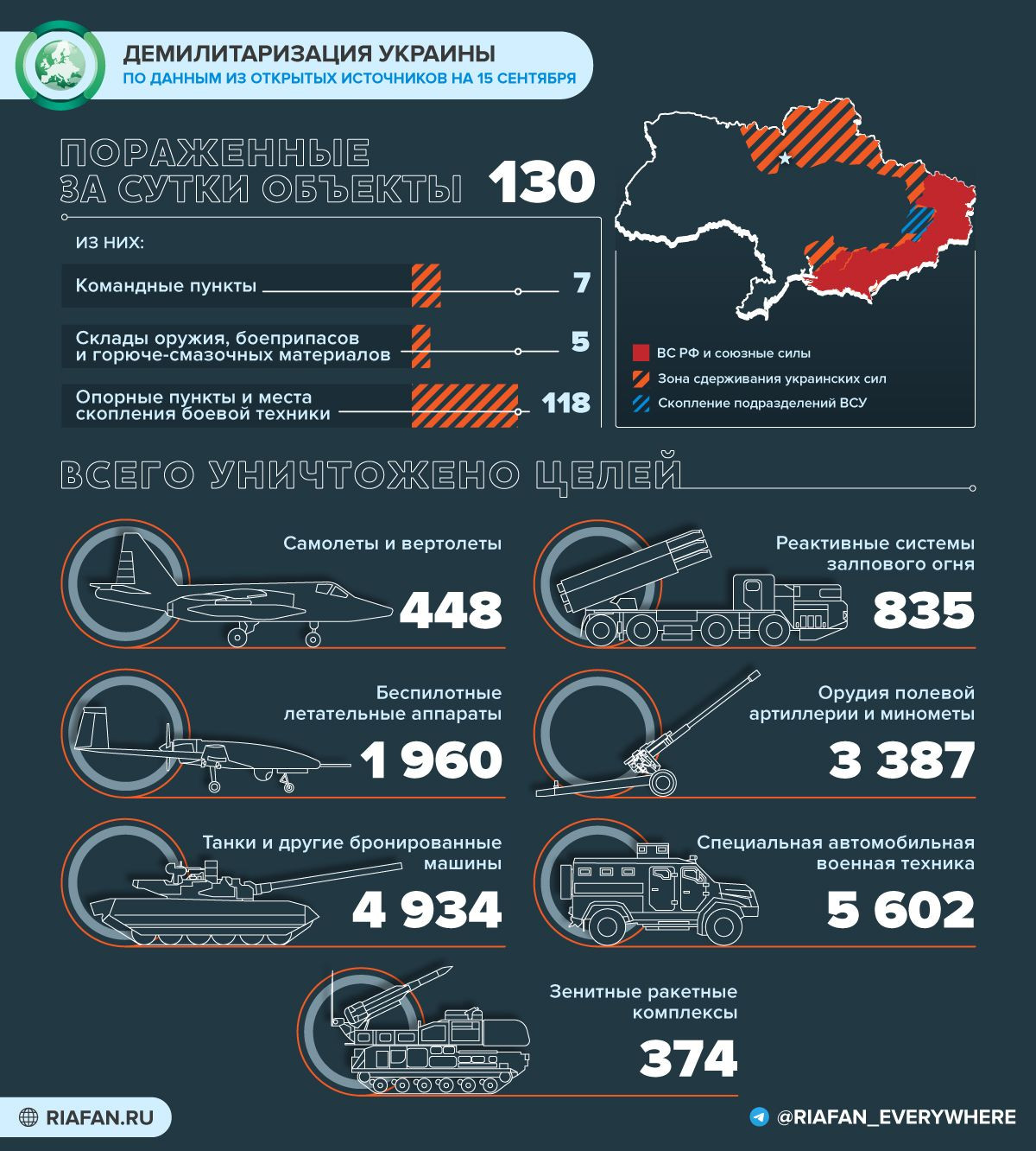 МО РФ сообщило об уничтожени пяти складов ракетно-артиллерийского вооружения и боеприпасов в Харьковской области и ДНР. Средствами ПВО за сутки сбиты 12 украинских беспилотников. В воздухе уничтожены две баллистические ракеты «Точка-У» в районах Перевальска (ЛНР) и города Донецк, а также 30 снарядов РСЗО HIMARS и «Ольха» в районах Каховской ГЭС, города Херсон и населенного пункта Трудовое Запорожской области.