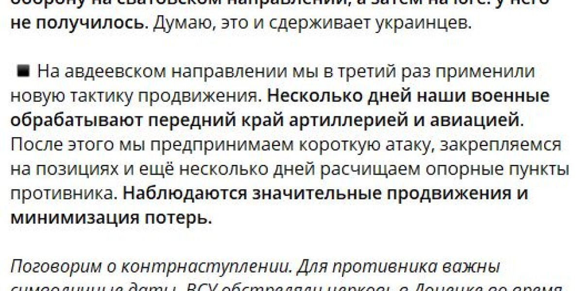 На авдеевском направлении мы в третий раз применили новую тактику продвижения. Несколько дней наши военные обрабатывают передний край артиллерией и авиацией. После этого мы предпринимаем короткую атаку, закрепляемся на позициях и ещё несколько дней расчищаем опорные пункты противника. Наблюдаются значительные продвижения и минимизация потерь.
