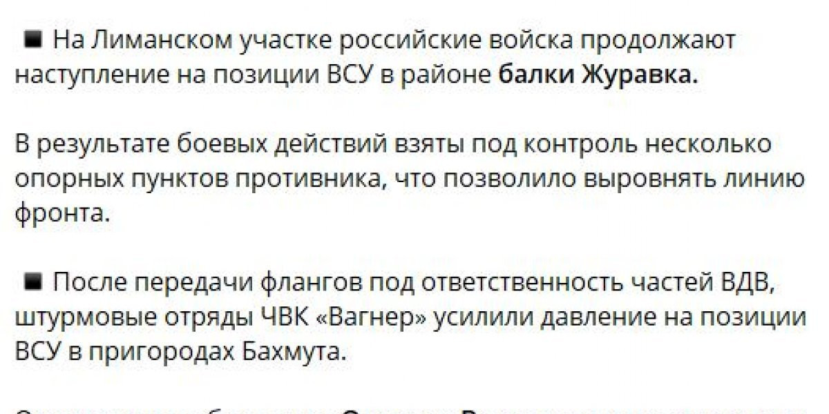 - — ВДВ, авиация и артиллерия оказывали поддержку действиям штурмовых подразделений в Артемовске;