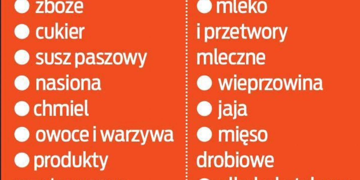 Зерно, сахар, сухой корм, семена, хмель, овощи и фрукты, продуты из овощей и фруктов, вино, говядина, молоко и молочные продукты, свинина, яйца, птица, алкоголь, мед.