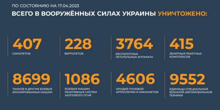 ? Всего с начала проведения специальной военной операции уничтожены: 407 самолетов, 228 вертолетов, 3764 беспилотных летательных аппарата, 415 зенитных ракетных комплексов, 8699 танков и других боевых бронированных машин, 1086 боевых машин реактивных систем залпового огня, 4606 орудий полевой артиллерии и минометов, а также 9552 единицы специальной военной автомобильной техники.