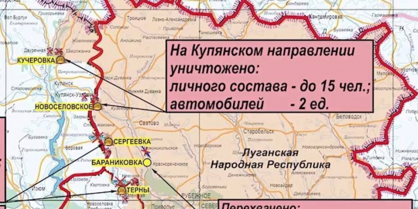 На Купянском направлении в результате нанесения поражения по скоплениям живой силы и военной техники ВСУ в районах населенных пунктов Кучеровка Харьковской области и Новоселовское Луганской народной республики уничтожено до 15-ти украинских военнослужащих и два автомобиля.
