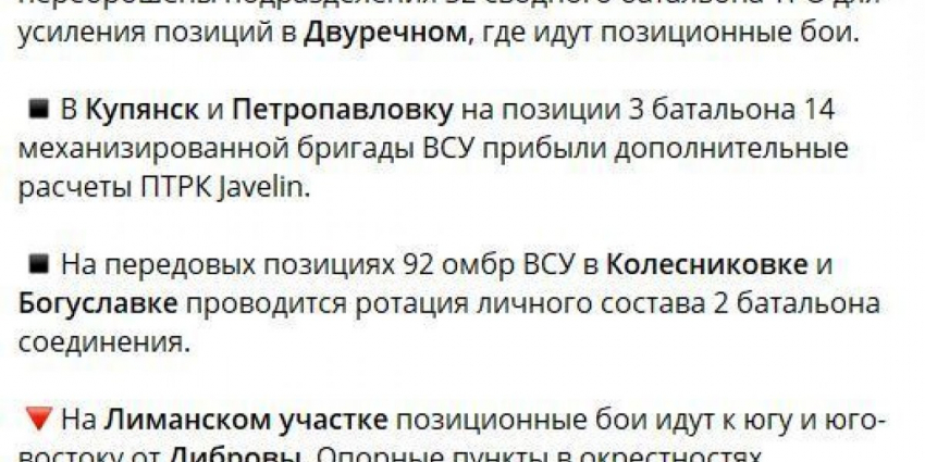 ▪️На Лиманском участке продолжаются позиционные бои в «серой зоне» южнее Дибровы. На данный момент ни одной из сторон не удалось закрепиться в окрестностях населенного пункта.