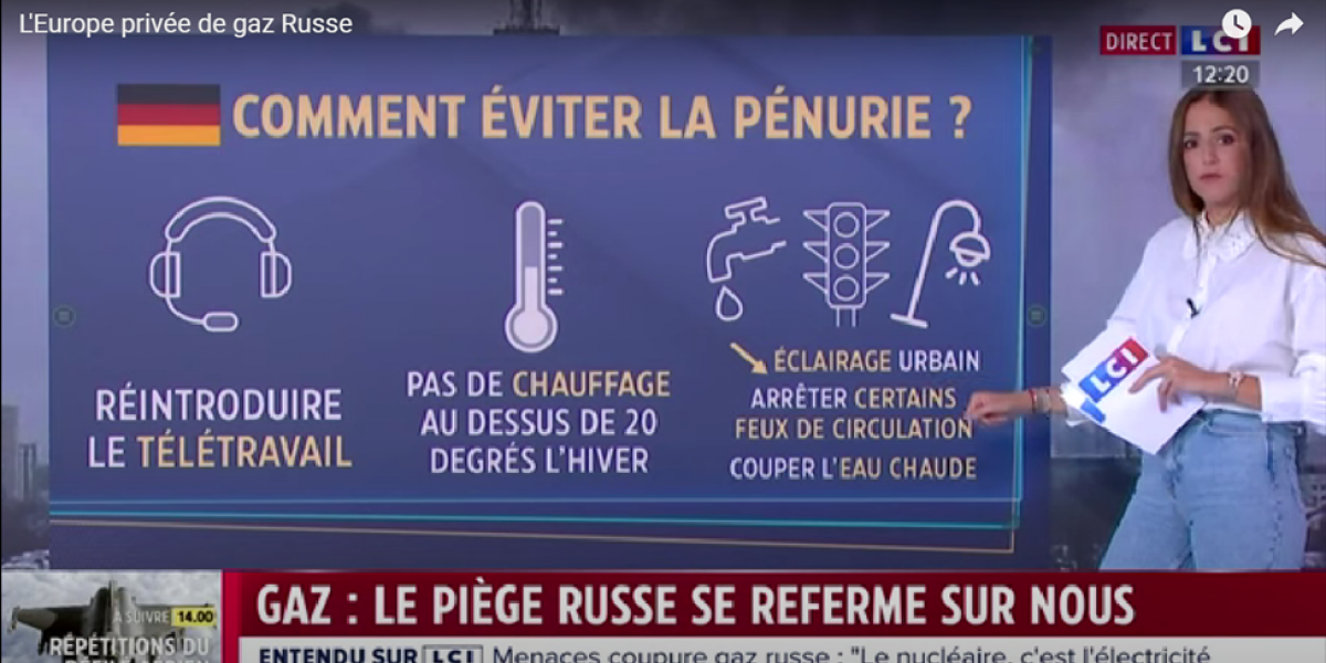 Катрин Жантиль (эксперт LCI): «Мы все помним слова Путина о том, что Россия по-настоящему ничего не начинала. Теперь мы понимаем, что имелся в виду не только военный аспект, но и экономический. И отключение газа и есть реальное начало. Цена на газ такова, что русские могут себе позволить продавать в два раза меньше газа, чем в прошлом году, а денег за него получить еще больше, чем годом ранее. Поэтому они сейчас в положении сильного. И Россия может сейчас прекратить поставлять газ и оказать сильнейшее давление на правительства западных стран.