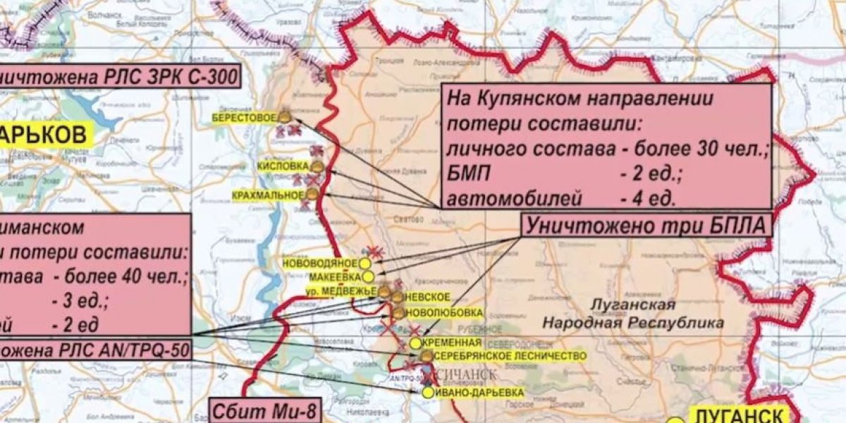 На Купянском направлении в результате огневого поражения опорных пунктов противника в районах населенных пунктов Кисловка, Крахмальное и Берестовое Харьковской области уничтожено более 30-ти украинских военнослужащих, две боевые машины пехоты и четыре автомобиля.
