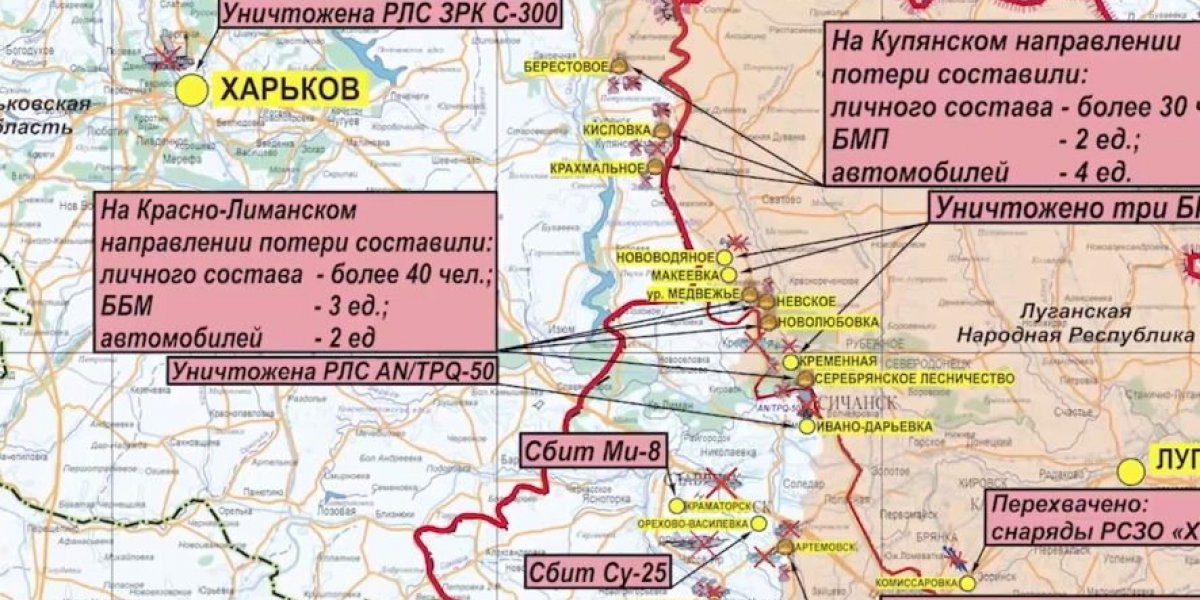 На Красно-Лиманском направлении в районах населенных пунктов Невское и Новолюбовка Луганской народной республики штурмовой авиацией и артиллерией нанесены удары по скоплению живой силы и техники противника. Кроме того, в районах урочища Медвежьего, а также Серебрянского лесничества в Луганской народной республики уничтожены две диверсионно-разведывательные группы ВСУ. Потери противника за сутки на данном направлении составили более 40 украинских военнослужащих и наёмников, три боевые бронированные машины и два пикапа.