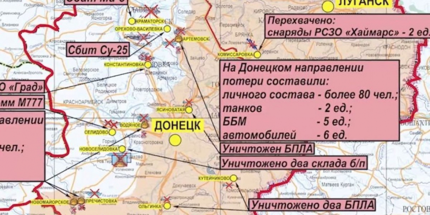 На Донецком направлении российские войска при поддержке штурмовой авиации и ударов артиллерии продолжали наступательные действия. Высокоточными ударами ВКС России нанесено поражение опорным пунктам противника в районе города Артемовск Донецкой народной республики. Уничтожено более 80-ти украинских военнослужащих и наёмников, два танка, пять боевых бронированных машин и шесть автомобилей.
