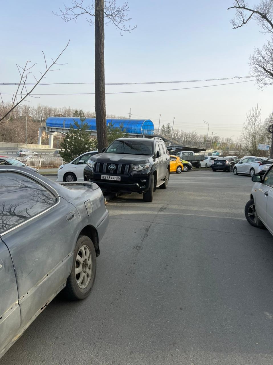 Припаркованные автомобили стали причиной затора на транспортной развязке у станции Спутник. Фото: Фото очевидцев