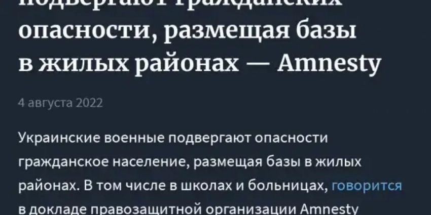 Именно поэтому запредельно предвзятая организация Amnesty International, прилежно отрабатывающая заказы Госдепа США, внезапно прозрела и увидела военные преступления со стороны боевиков ВСУ. С этим же связаны и недавние обстрелы Запорожской атомной электростанции.