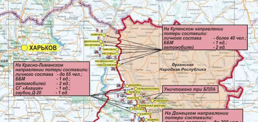 За сутки потери противника на данном направлении составили до 300 украинских военнослужащих и наемников, две боевые машины пехоты, четыре боевые бронированные машины, семь автомобилей, гаубицы Д-20 и «Мста-Б», самоходная артиллерийская установка «Акация», а также одна гаубица L118 производства Великобритании. Кроме того, в районе населенного пункта Выемка Донецкой народной республики уничтожен склад боеприпасов ВСУ.