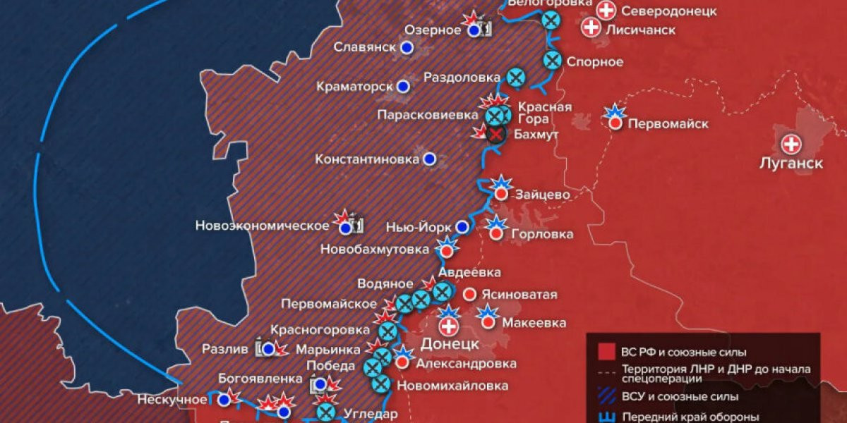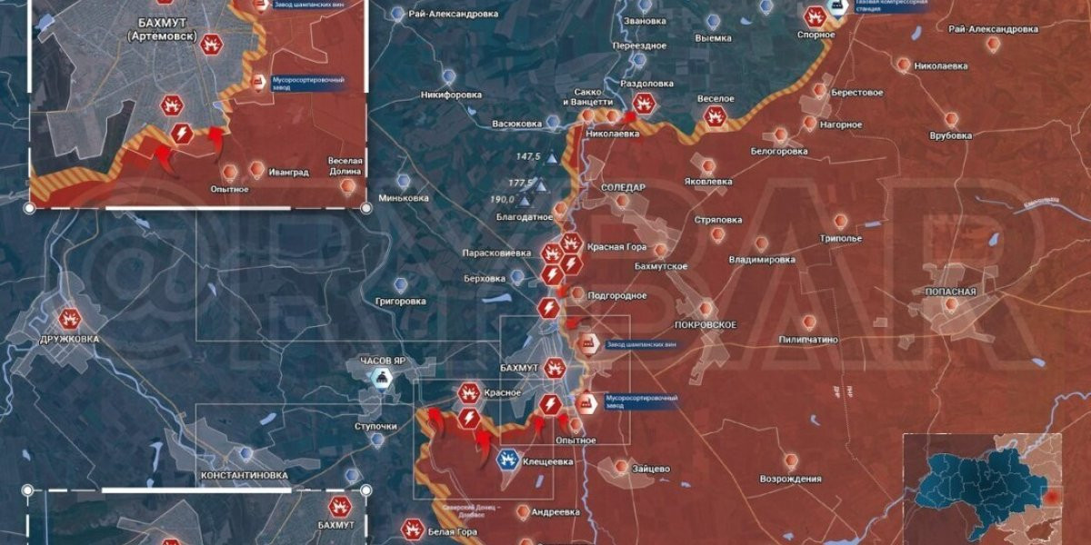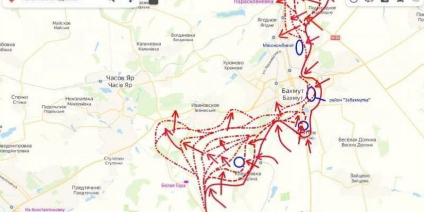 Штурмовые группы ЧВК «Вагнер» штурмуют позиции украинских подразделений в селе Ивановское (Красное), фактически отрезав его как от самого Артемовска, так и от Константиновки. Кроме того, вагнеровцы выходят на развилку дорог, контроль над которой позволит перерезать дорогу на Часов Яр.