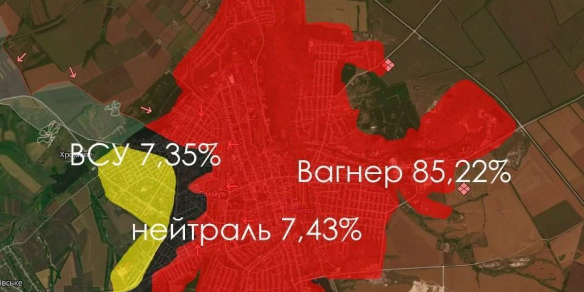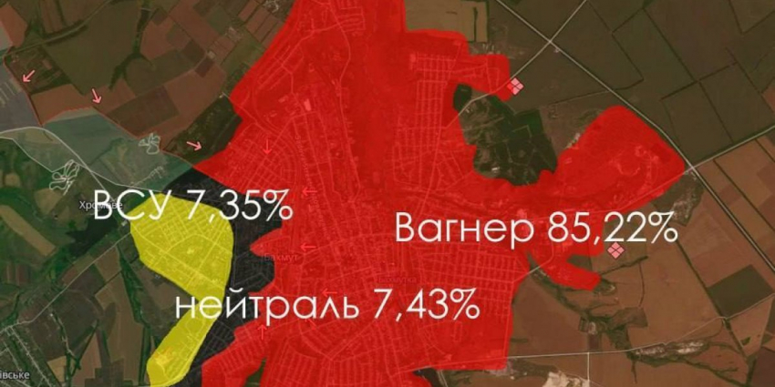 В сети появилась карта приблизительного контроля территорий. Так, согласно нее под контролем ЧВК «Вагнер» находится 85,22% территории Артемовска (Бахмута), а под контролем ВСУ всего 7,35%. В серой зоне — 7,43%.