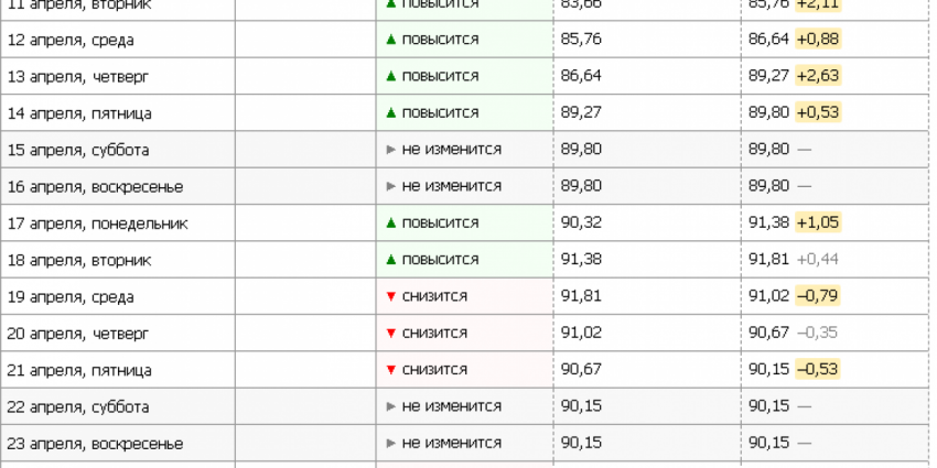 Сейчас нет факторов для укрепления рубля, кроме налогового периода. По доллару поддержка располагается на уровне 80 рублей. Максимум зафиксирован на отметке 83,50. Ключевым сопротивлением на май выступает отметка 85 рублей за доллар. По евро — 93,00, юаню — 12,30. Если Минфин порадует сокращением дефицита бюджета, то ослабление рубля прекратится и можно будет рассматривать его коррекцию к доллару и евро, — добавил Владислав Антонов.