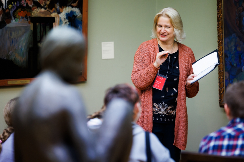 Людмила Жадан во время занятий кружка “Пиши-Читай” в Третьяковской галерее. Фото: Иван Новиков-Двинский / ГТГ