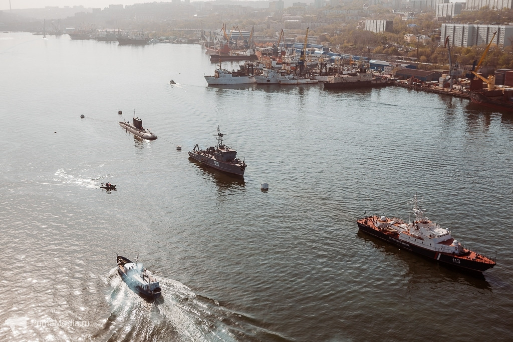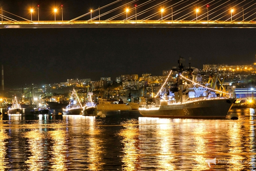 Отметим, что Владивосток стал одним из пяти городов России, наряду с Санкт-Петербургом, Североморском, Калининградом и Севастополем, жители и гости готорого увидели на 70-летие победы и морской парад. В бухте Золотой Рог в кильватерную колонну выстроились пять кораблей ТОФ: БПК “Маршал Шапошников”, МПК “Советская Гавань”, ракетный катер Р-24, базовый тральщик БТ-232 и подводная лодка Б-494 класса “Варшавянка”, а также сторожевой корабль Пограничной службы ФСБ РФ “Беркут”. Еще 7 мая на них подняли флаги расцвечивания, а с наступлением темноты включили ночную иллюминацию, поразившую всех.