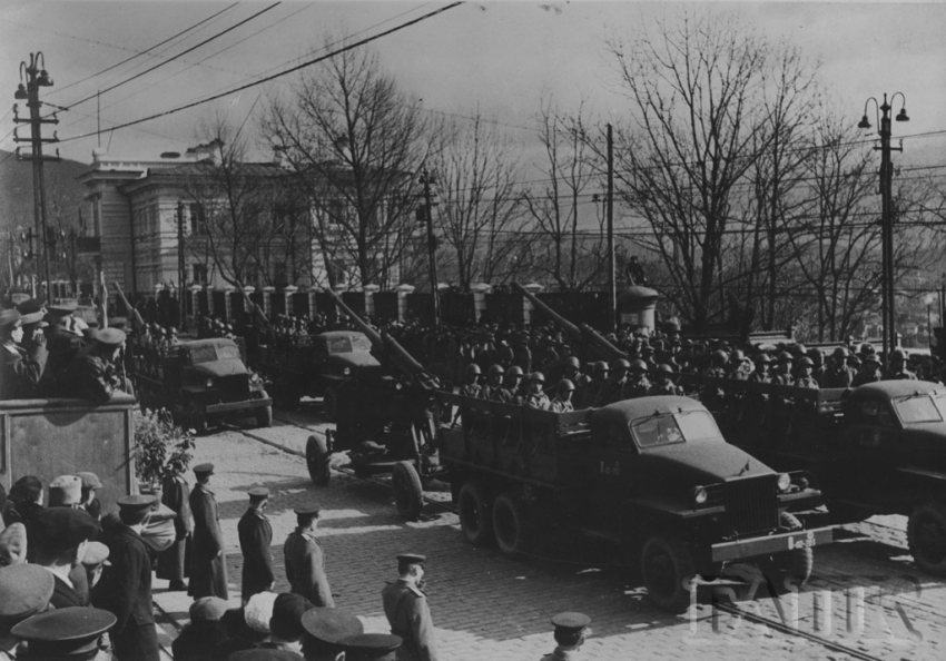 Во Владивостоке первый Парад Победы состоялся 9 мая 1965 года, в честь 20-летия окончания войны. Нет, конечно, в 1945 году победу во Владивостоке отмечали. Причем, именно 9 мая, когда диктор Юрий Левитан своим громогласным голосом по радио объявил о том, что война закончена. В госархиве хранятся фотографии, датированные 9 мая 1945 года, на которых видно: в этот день люди вышли на улицы города в порыве всеобщего ликования, торжественно проехала военная техника, которой еще, видимо, предстоит участвовать в сражениях с Японией. И все же первый Парад Победы на центральной улице — только 20 лет спустя.