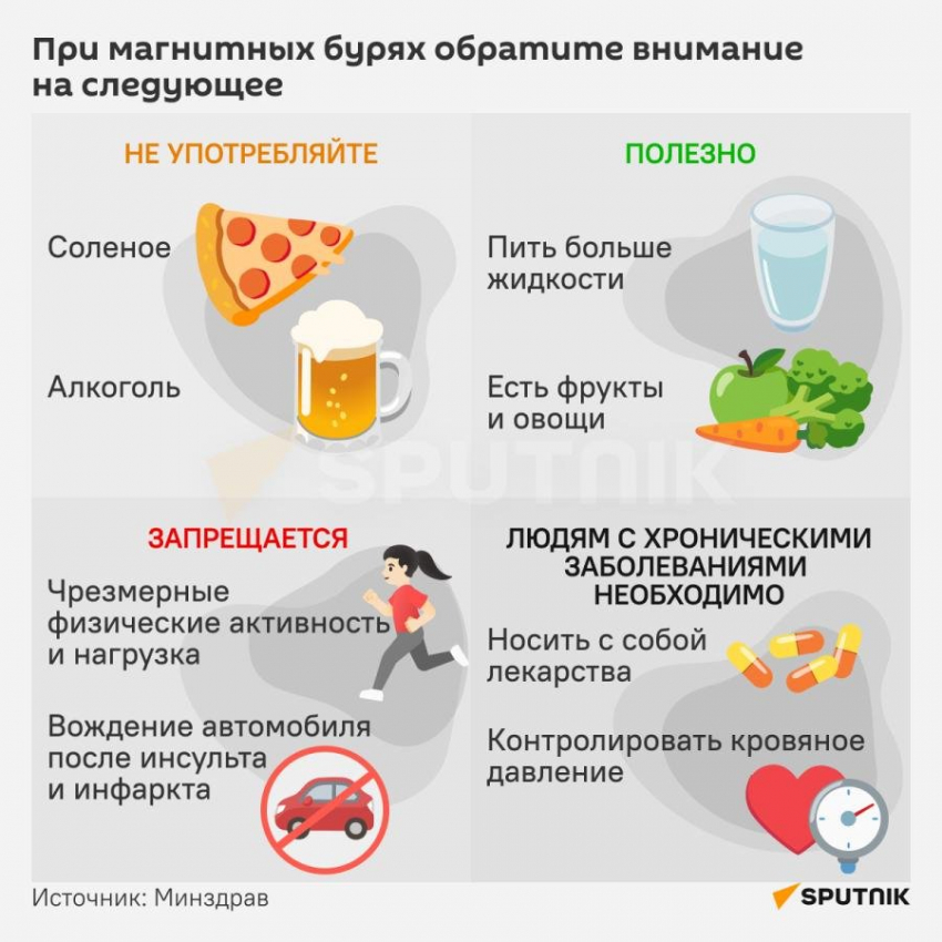 В дни магнитных бурь метеозависимым людям желательно внимательнее следить за своим питанием, образом жизни и здоровьем вообще.