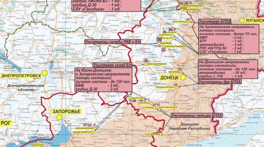Расчетами ЗРК «Тор», «Оса-АКМ» и «Стрела-10» сбиты 2 БпЛА «Лелека» и по одному - «Фурия» и «Валькирия». На Запорожском направлении в рамках контрбатарейной борьбы огнем артиллерии уничтожены САУ в районе Степногорска и 2 минометных расчета в районах Луговского и Белогорья.