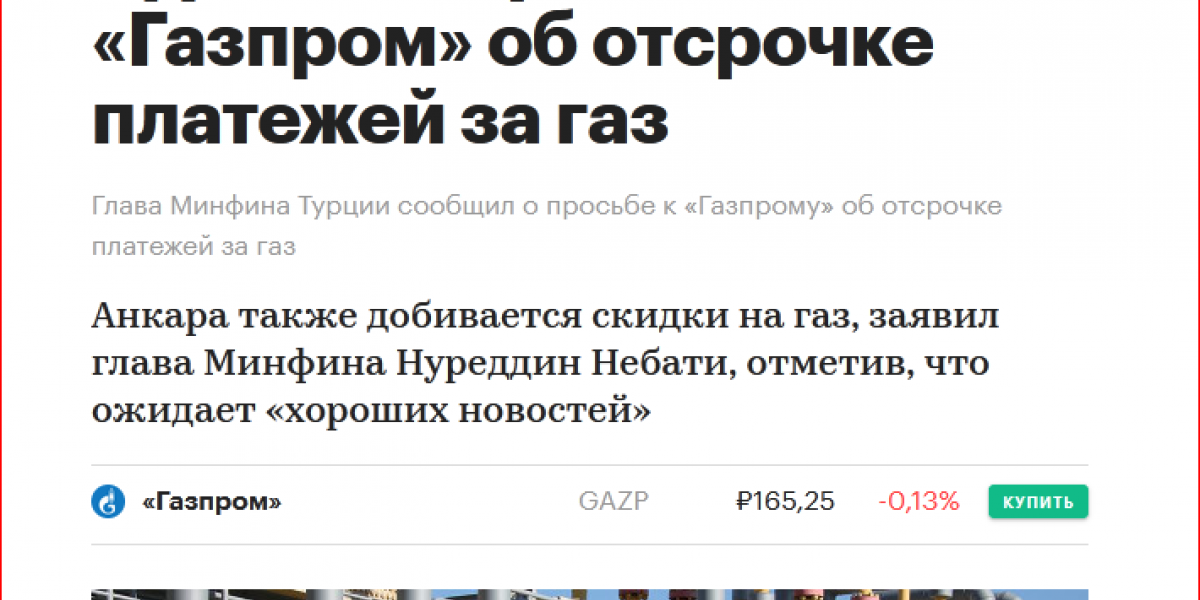 Газпром пока не подтверждает, что Botas (турецкая газовая госкомпания) обращалась к ним официально. На уровне слухов — идёт обсуждение не отсрочки, а именно скидки. Также стоит отметить, что просят отсрочку только по части платежей. Ранее с Турцией была достигнута договорённость об оплате рублями 25% стоимости поставляемого газа. Вопрос — о какой части просят отсрочку и не здесь ли «собака зарыта»?