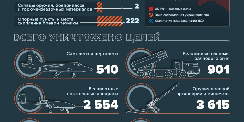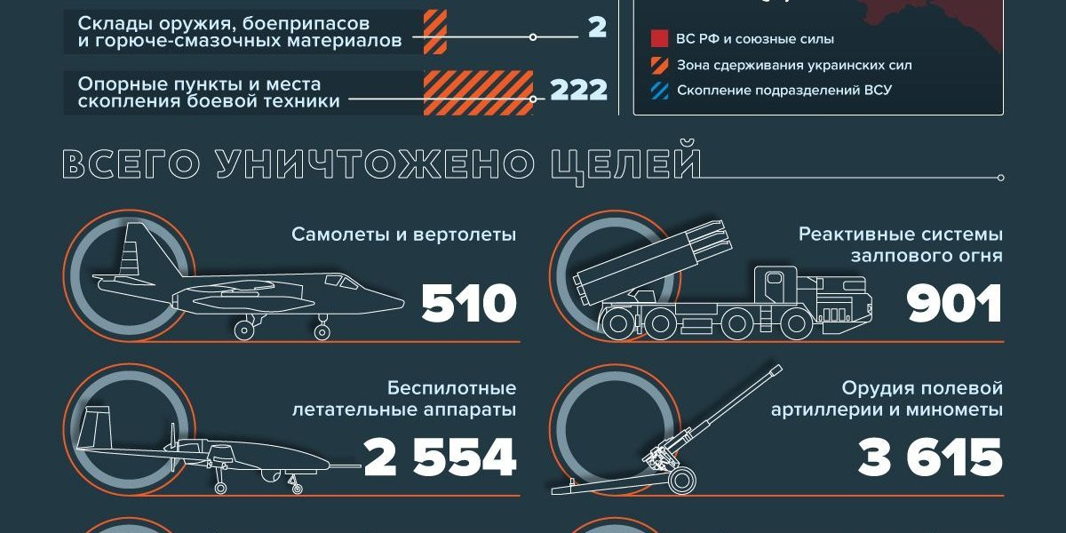 Кроме того, поражены 72 артбатареи Вооруженных сил Украины (ВСУ), 144 района скопления живой силы и техники, пункт управления в Вольнянске, а также два склада боеприпасов и ракетно-артиллерийского вооружения. Над Черным морем и в районе Севастополя сбиты пять беспилотников противника.