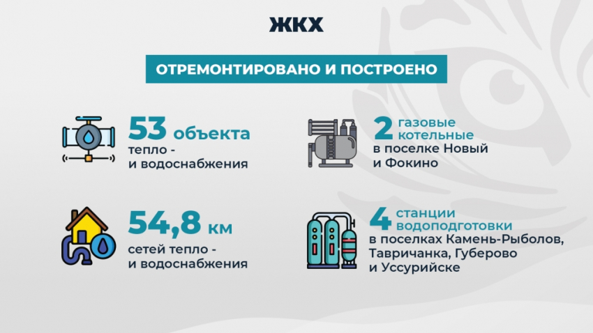 С 2018 по 2022 годы выполнен капитальных ремонт 28 объектов культуры. 39 организаций Приморья получили современное оборудование. Построены три дома культуры в Надеждинском районе и Чугуевском округе.