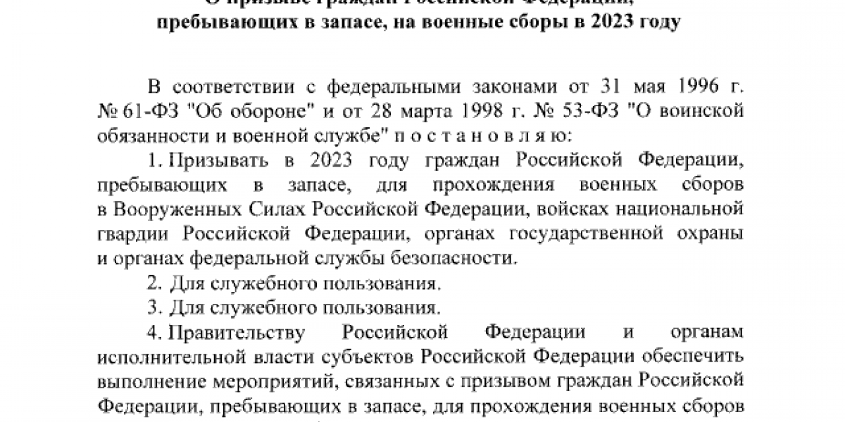 В указе говорится: «Постановляю призвать в 2023 году граждан Российской Федерации, находящихся в запасе, на военные сборы в Вооруженных Силах Российской Федерации, в войсках национальной гвардии Российской Федерации, в органах государственной охраны и федеральной службы безопасности».