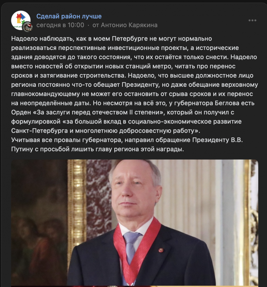 Сообщение Карякина опубликовали авторы сообщества «Сделай район лучше» в социальной сети «ВКонтакте». Активист напомнил, что в свое время Беглов получил Орден «За заслуги перед отечеством II степени» с формулировкой «за большой вклад в социально-экономическое развитие Санкт-Петербурга и многолетнюю добросовестную работу», однако регулярные системные провалы и управленческие ошибки служат наглядной демонстрацией низкого качества работы чиновника.