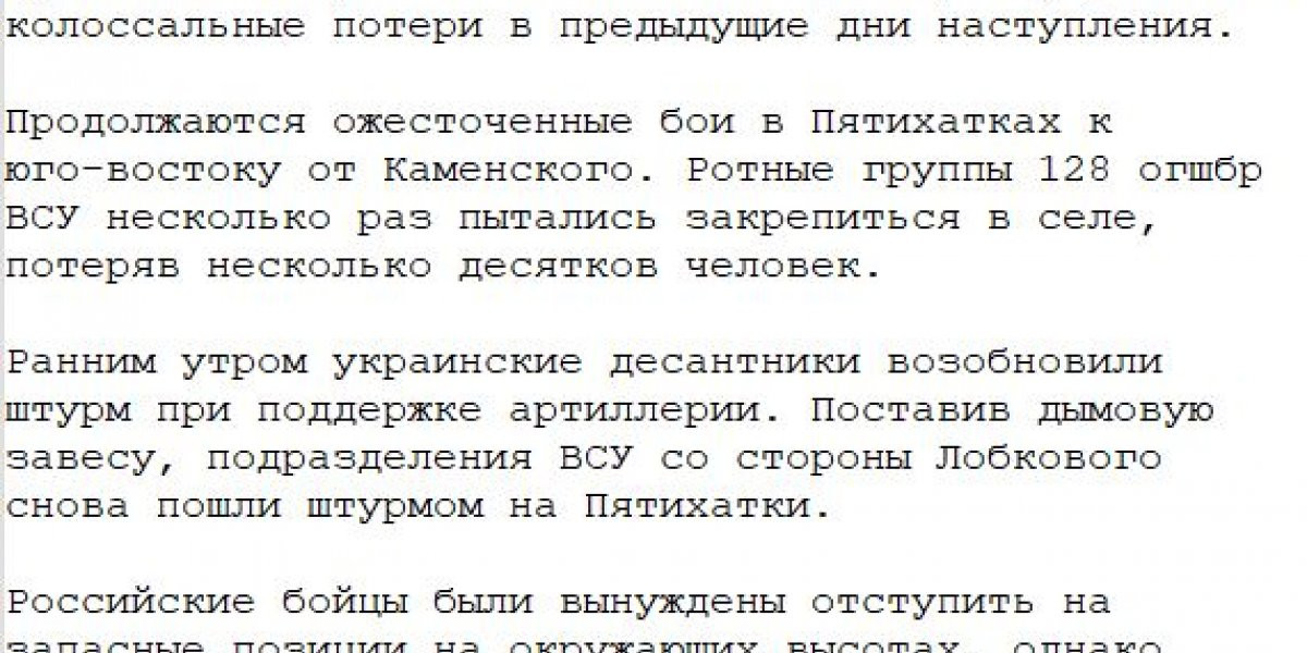 Также канал опубликовал информацию о вероятном восстановлении контроля над ранее оставленным селом Пятихатки. Днем 18 июня ряд источников сообщил, что под напором пехоты ВСУ российские войска отошли на второй рубеж обороны, после чего по украинским формированиям были нанесены массированные авиационные и артиллерийские удары.