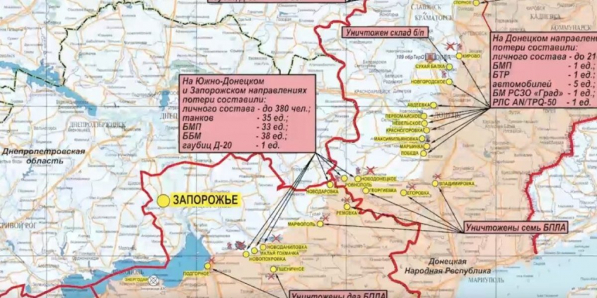 Статистика МО РФ подтвердила сообщения ряда неофициальных источников о том, что истекшие сутки на Южно-Донецком и Запорожском направлениях были крайне напряженными: всего было уничтожено до 380 украинских солдат, 35 танков, 71 бронемашина и гаубица Д-20.