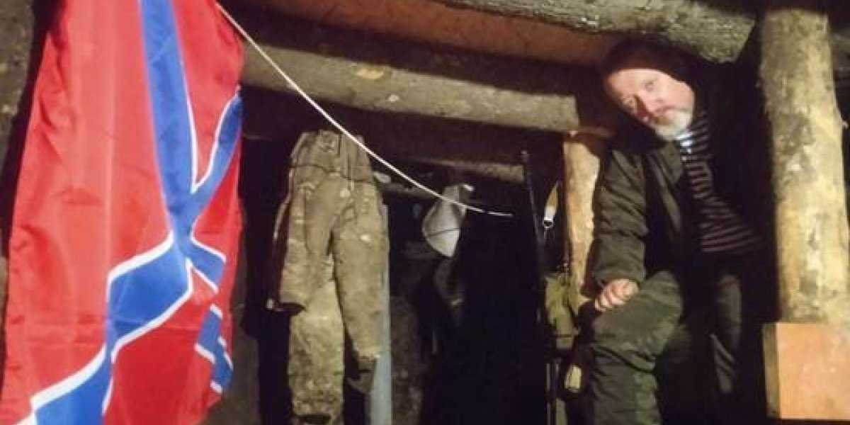 Сообщения сопровождаются снимком Стрелкова, выгядывающего из-за угла в землянке. Тут же висит флаг Новороссии. Источник