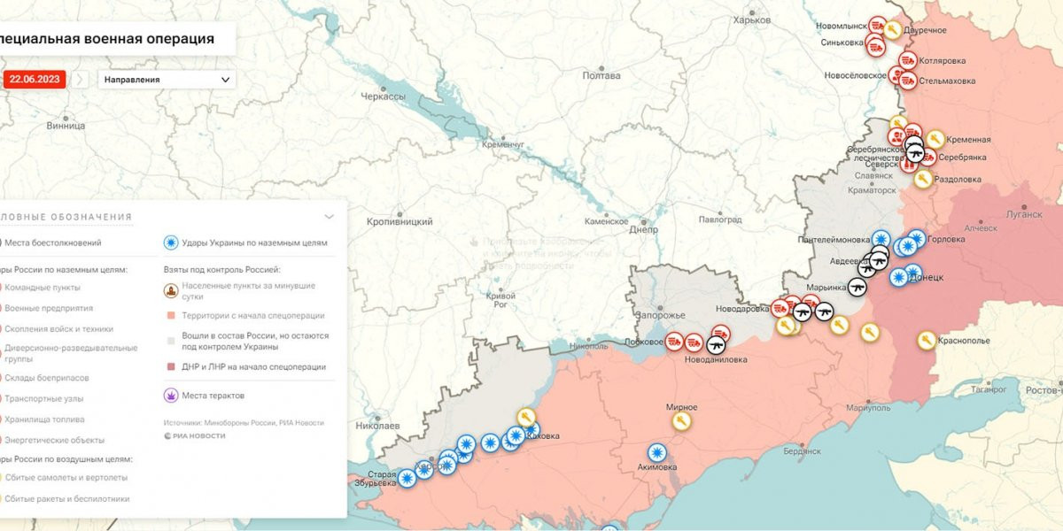- Карта боевых действий на Украине, 22 июня 2023г., от РИА Новости. Карта специальной военной операции.