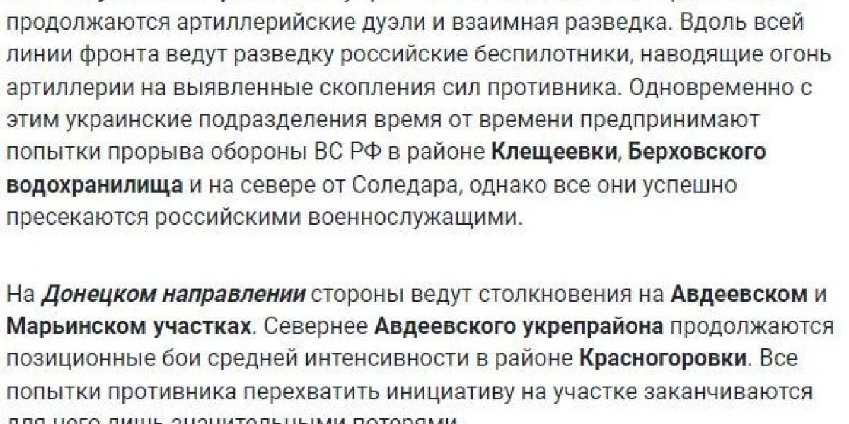 ВСУ на Угледарском участке атаковали в районах Ровнополя, Старомайорского и Урожайного, продвинуться не сумели. На Донецком фронте российские войска вели наступление у Новомихайловки и на юго-западных подступах к Авдеевке. Кроме того, военкор Семен Пегов сообщает о контратаке ВС РФ у Орехово-Василевки на Артемовском направлении.