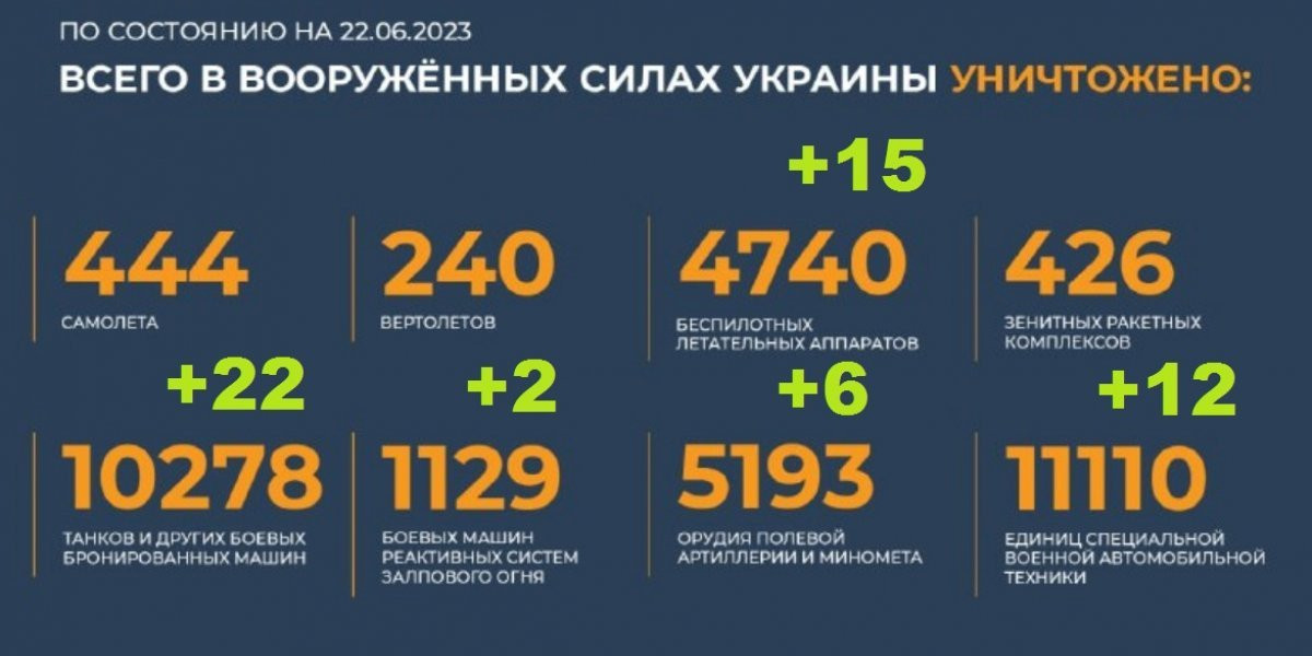 ? Всего с начала проведения специальной военной операции уничтожено: 444 самолета, 240 вертолетов, 4740 беспилотных летательных аппаратов, 426 зенитных ракетных комплексов, 10278 танков и других боевых бронированных машин, 1129 боевых машин реактивных систем залпового огня, 5193 орудия полевой артиллерии и минометов, а также 11110 единиц специальной военной автомобильной техники.