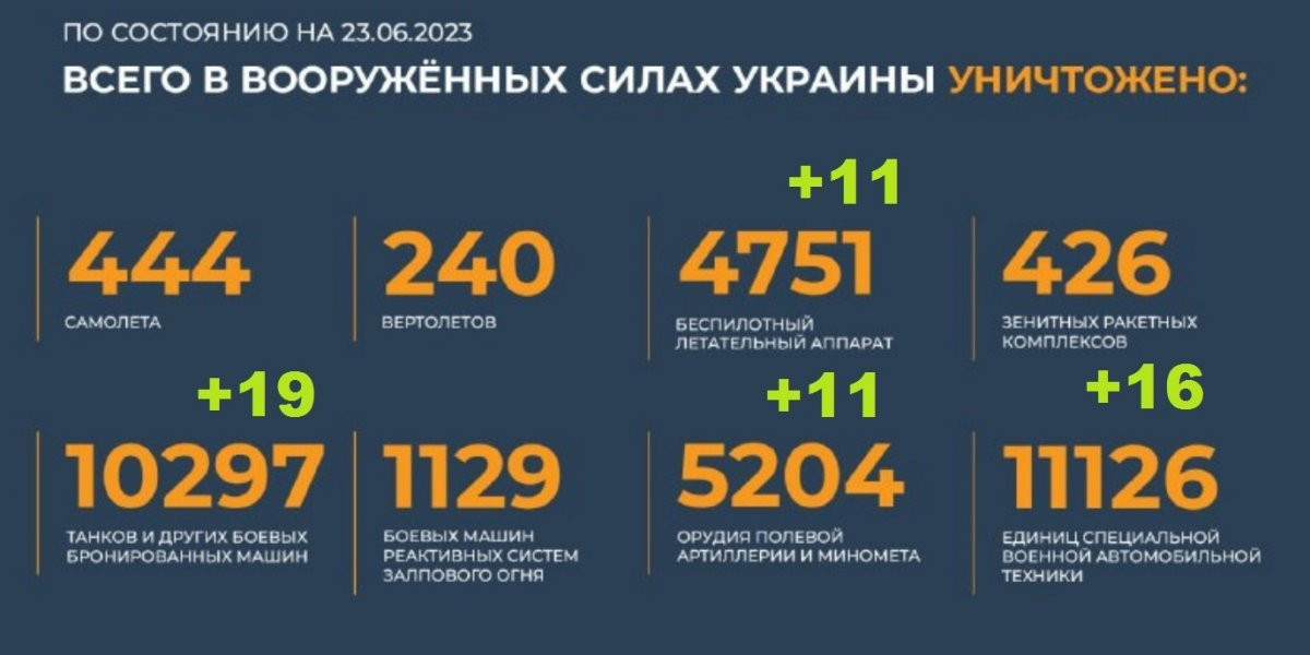 Потери Украины на сегодня 23.06.2023 Всего с начала проведения специальной военной операции уничтожены: 444 самолета, 240 вертолетов, 4751 беспилотный летательный аппарат, 426 зенитных ракетных комплексов, 10297 танков и других боевых бронированных машин, 1129 боевых машин реактивных систем залпового огня, 5204 орудия полевой артиллерии и минометов, а также 11126 единиц специальной военной автомобильной техники.