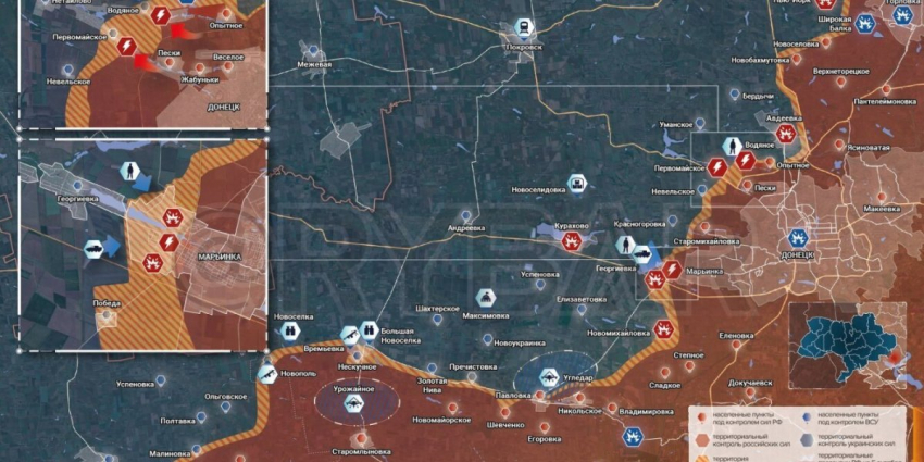 Врио главы ДНР Денис Пушилин заявил, что в Марьинке зачищены все высотки, сейчас они контролируются союзными силами. Пушилин не исключил, что продвижение российских подразделений в скором времени может привести к тому, что территория города перейдет под их контроль.