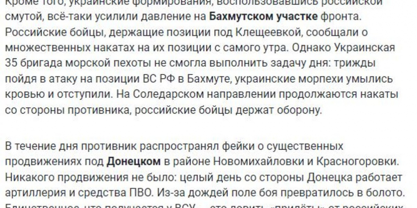 За последние два дня у врага было окно возможностей на фронте и им попытались воспользоваться. Но даже внутренние распри в тылу не обеспечили боевикам ничего, кроме потерь и сожженной техники. Бойцы российской армии героически противостояли хорошо вооруженным частям ВСУ. Без паники и смуты в управлении, никто не оставил позиции, в результате чего все экстренные планы украинского командования конвертировались в потери, в том числе имиджевые.