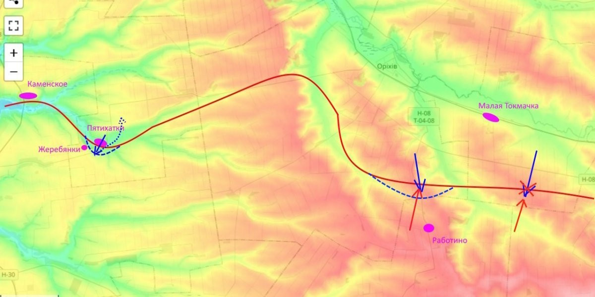 Тяжелые бои идут на Ореховском участке, где противнику удалось немного продвинуться в направлении Работино. Западнее, у Пятихаток, российские войска продолжают контролировать высоты вокруг села, не позволяя ВСУ накапливать силы для атак.