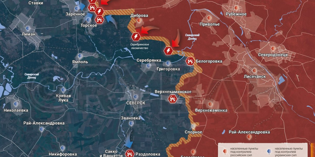 ВСУ начали контрнаступление под Кременной на Краснолиманском участке фронта. По словам Архангела Спецназа, российские позиции на Торском выступе атакуют силами шести бригад ВСУ.