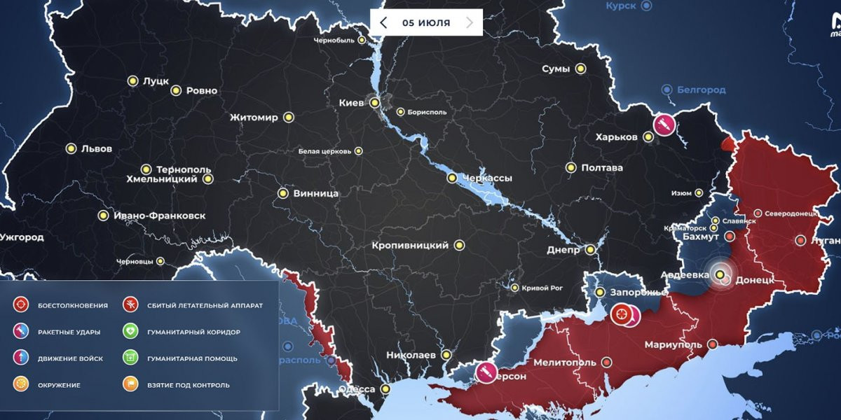 - Карта боевых действий на Украине сегодня, обстановка 5 июля 2023 года от Mash. Бои за Авдеевку