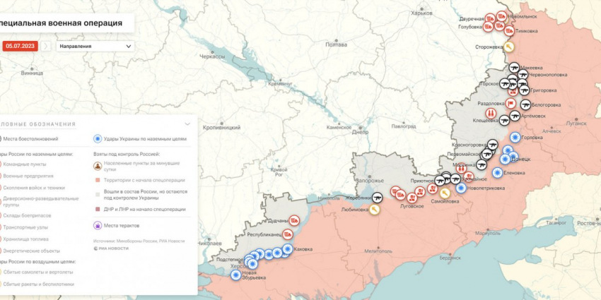 - Карта боевых действий на Украине, 5 июля 2023г., от РИА Новости. Карта специальной военной операции.
