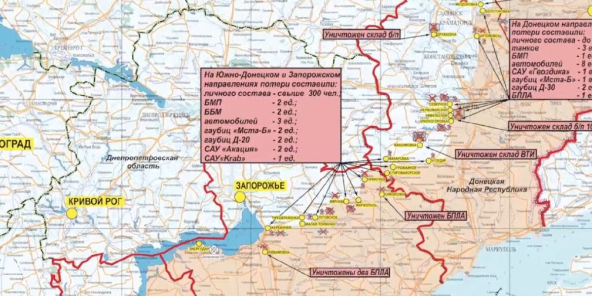 Запорожское направление: Пятихатки до сих пор в серой зоне, все попытки ВСУ взять село под полный контроль окончились провалом. На Ореховском участке российская артиллерия кошмарила вражеские окопы под Работино. Также боевики безуспешно атаковали позиции ВС РФ в районе Урожайного и Старомайорского.