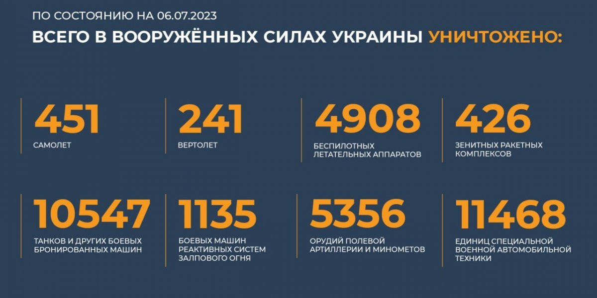? Всего с начала проведения специальной военной операции уничтожены: 451 самолет, 241 вертолет, 4908 беспилотных летательных аппаратов, 426 зенитных ракетных комплексов, 10547 танков и других боевых бронированных машин, 1135 боевых машин реактивных систем залпового огня, 5356 орудий полевой артиллерии и минометов, а также 11468 единиц специальной военной автомобильной техники.