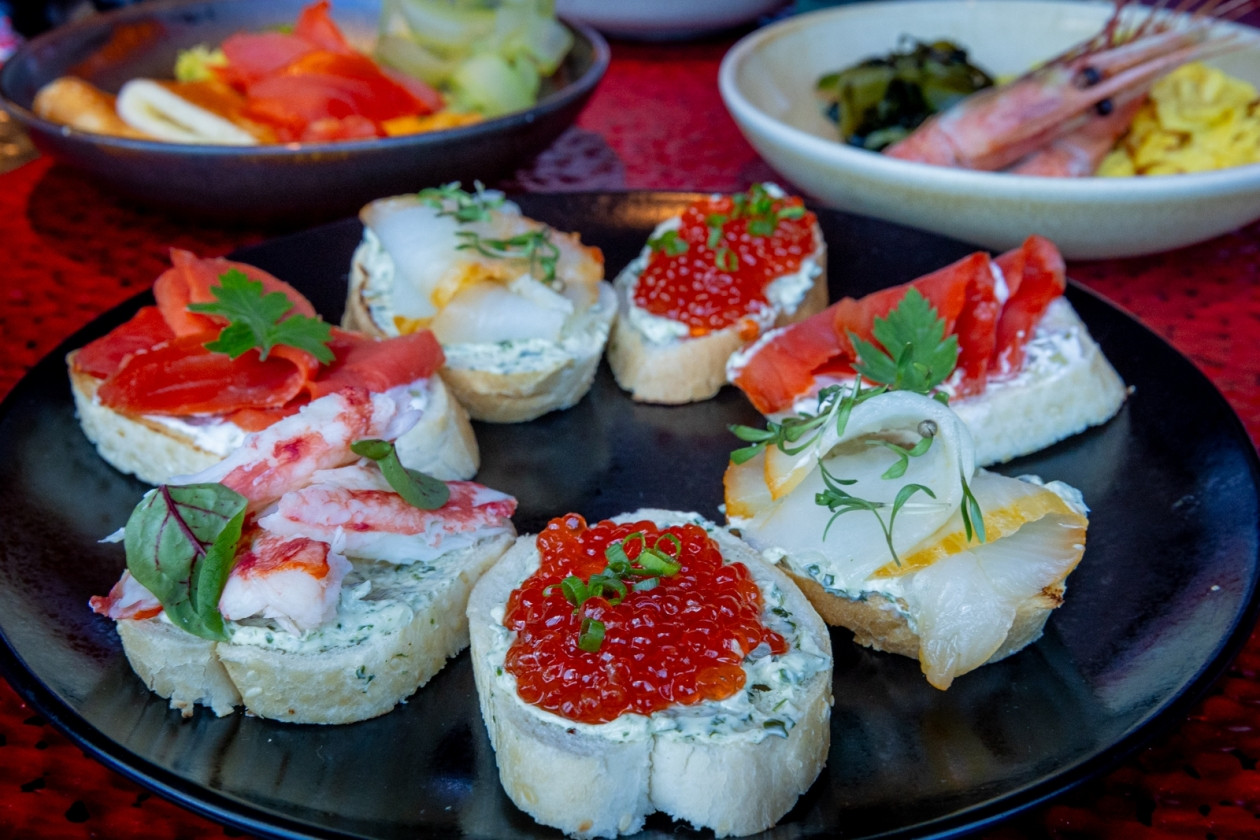 Ну и какой же завтрак без бутербродов? Они у шефа тоже не обычные, а дальневосточные — с фалангой камчатского краба, малосольной неркой, красной икрой и палтусом холодного копчения. Ещё больше “морского” вкуса придают бутербродам водоросли, смешанные с маслом.