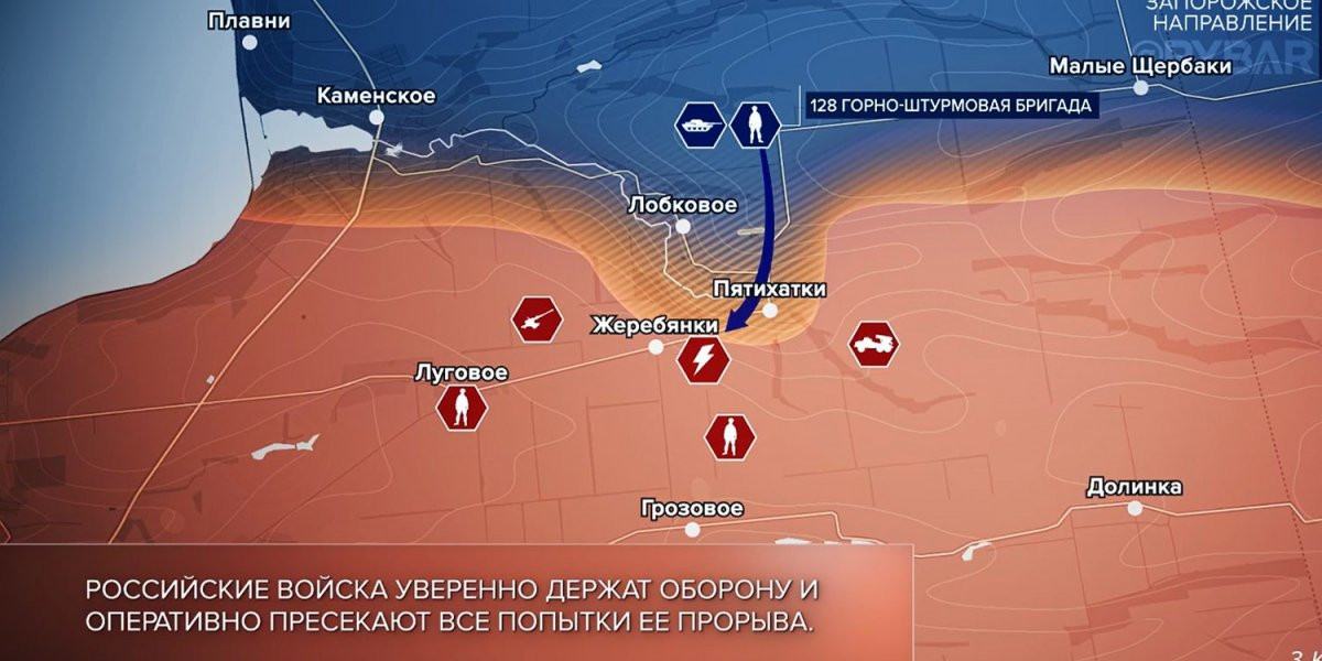 Наши бойцы отбивают атаки ВСУ в районе Пятихаток. На Ореховском участке боевики безуспешно пытались наступать малыми группами у Работино. На Времьевском выступе наши пресекли продвижение врага в направлении Приютного и Старомайорского.