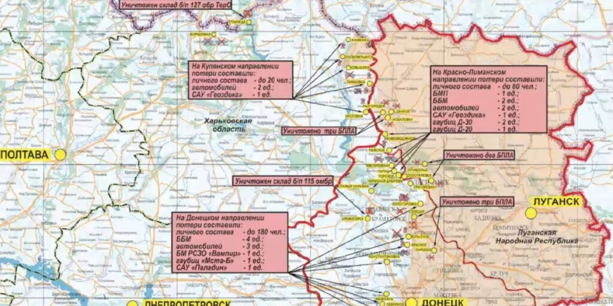Кроме того, Конашенков сообщил, что помимо живой силы ВСУ понесли потери в военной технике: четыре бронемашины, три автомобиля, чешская РСЗО RM-70 Vampire, САУ «Мста-Б», а также американская САУ M109 Paladin.