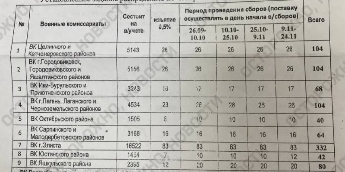 В документе указано, сколько людей стоит на военном учете и сколько планируют призвать с каждого района. Сам призыв разделен на четыре этапа: с 26 сентября по 10 октября, с 10 октября по 25 октября, с 25 октября по 9 ноября и с 9 ноября по 24 ноября.