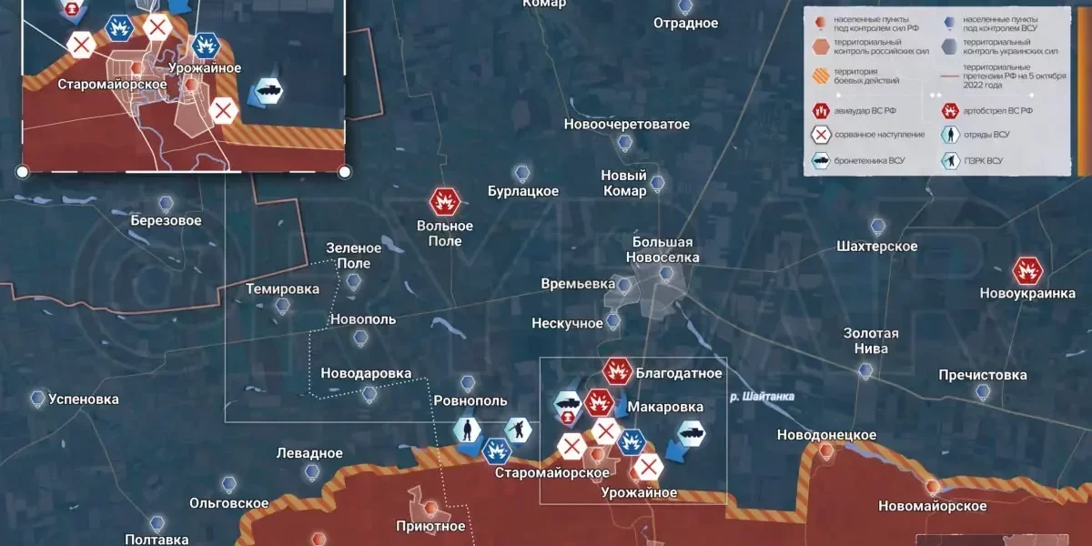 На Времьевском участке после того как подразделения противника смогли закрепиться у Балки Грушевой, внимание ВСУ вновь переместилось на рубеж Старомайорское — Урожайное.