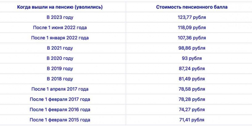 Стоимость пенсионного балла в зависимости от даты выхода на пенсию