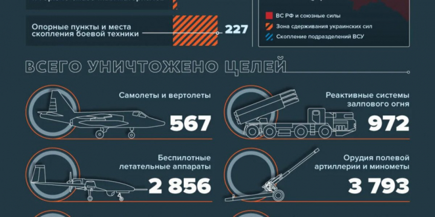 Ударами оперативно-тактической и армейской авиации, ракетных войск и артиллерии поражены 89 артподразделений, живая сила и военная техника в 126 районах, 3 склада боеприпасов и ракетно-артиллерийского вооружения ВСУ.